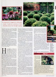 Cognitive therapy and Prozac helped him cope in the past, but now he uses only lightboxes. Wisely, he never took to the drink, “I had hepatitis when I was 14, and my liver is fucked.” In his darkest moments, “I can’t garden, I can hardly write”. Yet he forces himself to grind out his weekly column for the Observer. “I’m highly disciplined, if I didn’t do it, I’d be in trouble.”