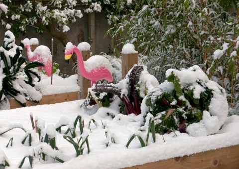 In the morning, the garden was covered in an inch of snow — both the conventional variety, and our new acquaintance, graupel. The next night we had two more inches of white stuff. It has been bone-chillingly cold for days, and there is no sign of the conditions out there changing back to the comparatively balmy maritime weather that we normally experience in this clement corner of Ireland.