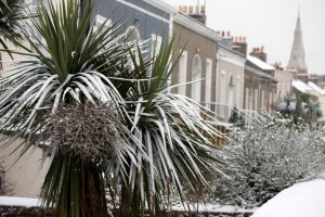 Ireland is often a green and misty land (although less greener than usual during this cold winter). And one of the things that surprises visitors is the sight of “palm trees” incongruously raising their mop tops through the Celticky fog. They decorate our towns and suburbs, they are blasted by the salt air on our seafronts, and they are often seen in pairs guarding the entrances to farmhouses. But, they are not palm trees at all: they are the New Zealand native, Cordyline australis. They enjoy the common name of “cabbage tree”, supposedly because settlers in New Zealand found the young leaves to be a tolerable substitute for cabbage.
