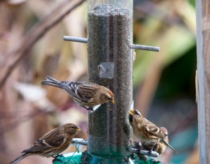 The little redpolls, who arrive in winter and depart in spring, are still visiting. So there is a jumble of birdlife at the feeders.
