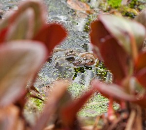 Frogs are impossible to sneak up on. Their bulging eyes give them near all-round vision. And our pond is not the most secure place. While crouching behind the Bergenia ‘Wintermärchen’ and hoping to get a better photo, I am assailed by an eye-stinging pong of fox urine. Our neighbourhood foxes, I imagine, are partial to the occasional frog dinner, and have been patrolling the garden more than usual.