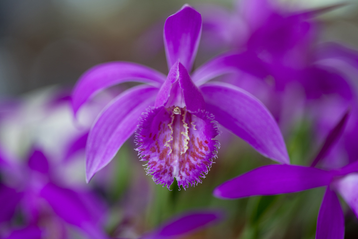 Some, like many of the saxifrages, cover their tight, wind- and drought-resistant foliage entirely with shimmering, perfect stars. Others, the pleiones, for instance — or terrestrial orchids — erupt in spring from shiny, green bulbs into flamboyant pink affairs with five winged petals and a fringed tube whose corrugated and spotted innards draw you in for a closer view.