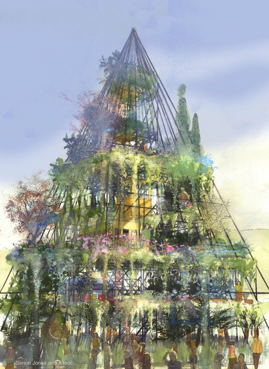 The elevated terraces will accommodate self-contained gardens, each with a different flavour and mood, as if they are tended by different personalities. So there might be a vegetable plot (complete with compost bin and shed), a patch of jolly annuals and hanging baskets, a cool sophisticated balcony for ladies who lunch, and any number of other high-level plots.