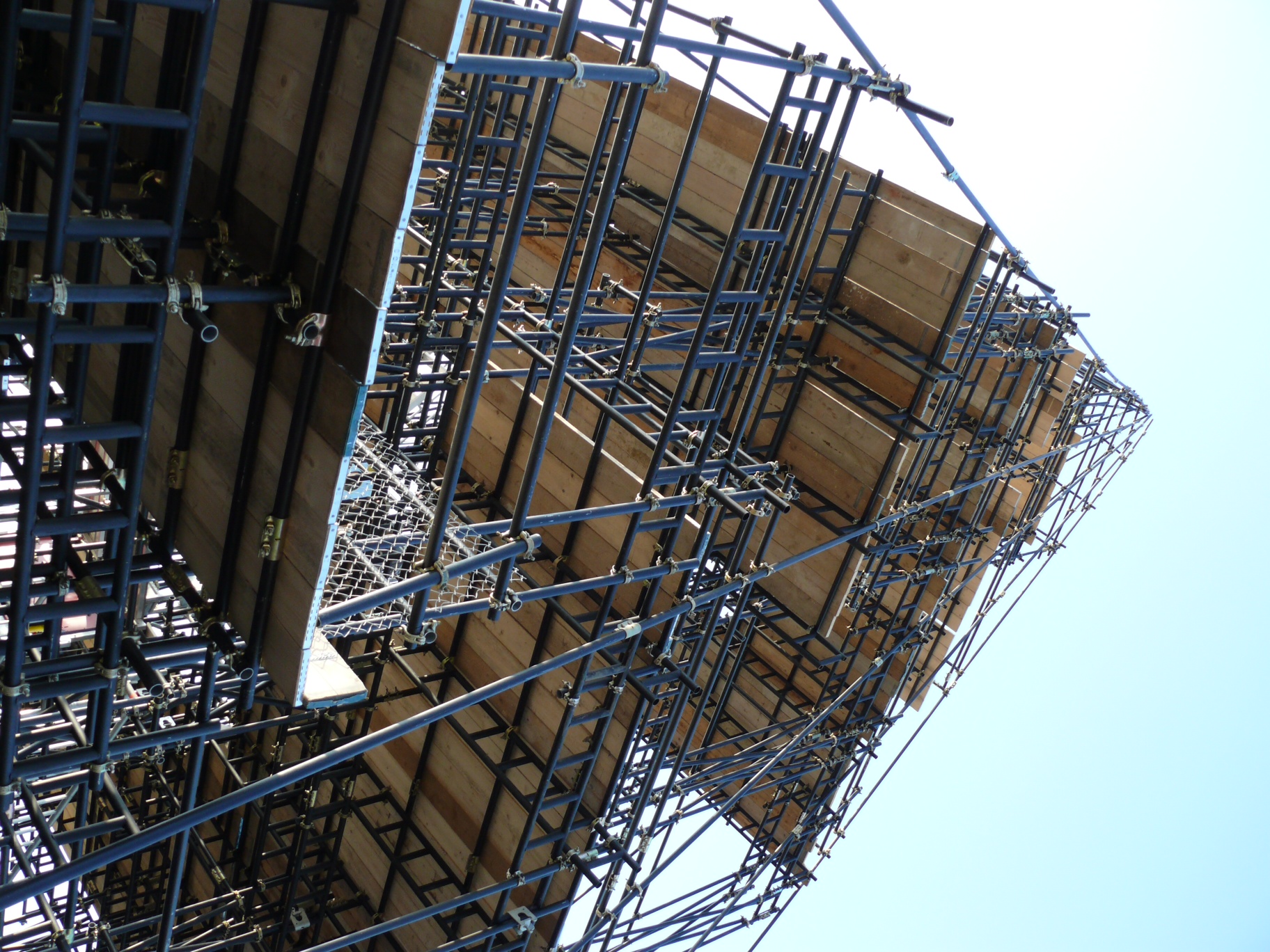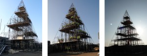 On the way to the top — which can be reached by an internal lift, or by metal staircases — there are seven different levels, partially decked over with scaffolding planks, giving the tower a floor area of 600 square metres.
