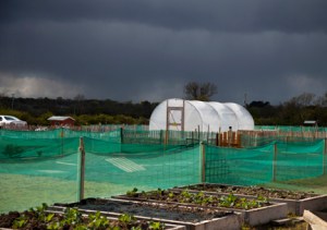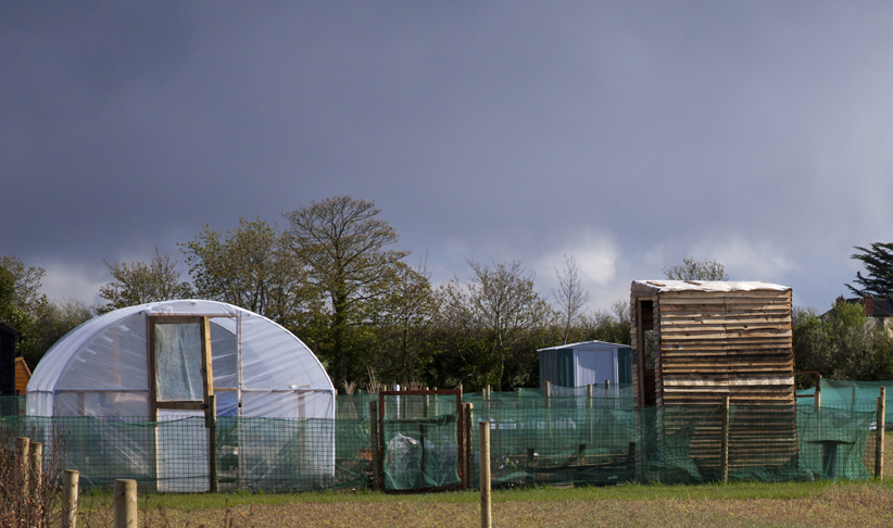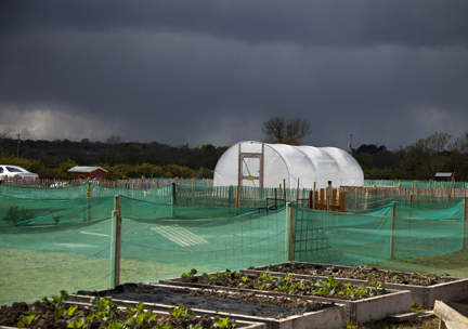 Their tunnel, newly erected on their ten by twenty metre plot, is one of a growing number at the site. Every week another one pops up, like a giant mushroom on the landscape. In these early days, while the hedges and trees that will eventually diffuse the wind are still in their infancy, the protection that the polyethylene-covered hoop-houses afford is very welcome. “I sold all the baby gear to get this!” explains Caítríona. “I said: ‘no more kids: let’s get a polytunnel instead.’ ” So they did.