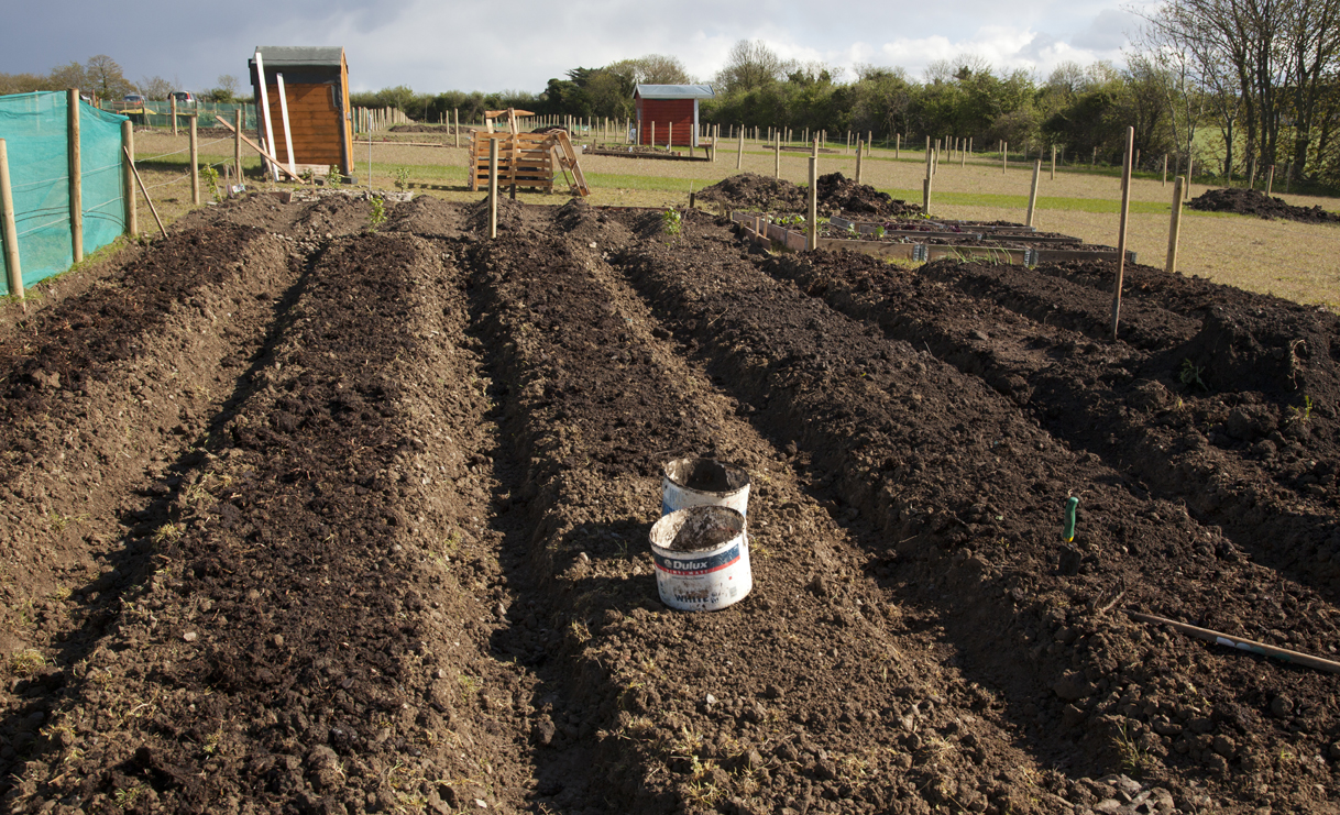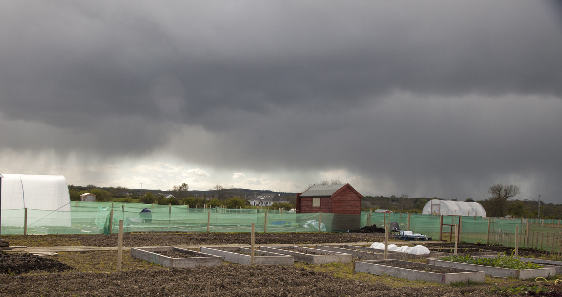 It’s May when I visit the new Balbriggan Community Allotments, but it’s cold, with a wicked northwest wind blasting across the six acre site. Exposure is often a problem with new allotment schemes, and this one, which opened in February, is no exception. On former agricultural land with little shelter, and half a kilometre from the sea, it gets weather from all sides. The new plot holders are resourceful types, though, and most have erected windbreaks of polypropylene netting around their domains. When the sun shines, the green mesh catches and multiplies the light, sending a shimmering zig zag of iridescence across the plots.