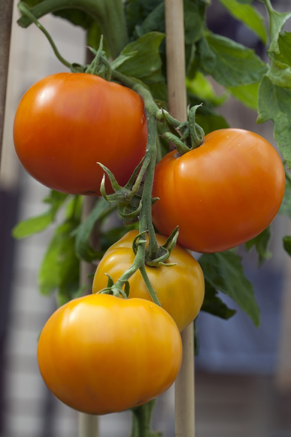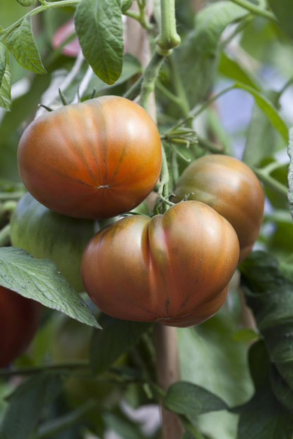 Home-grown tomatoes, as well as being good to eat and not too difficult to grow, give an almost cartoon-like demonstration of genetic diversity. There are hundreds of varieties available to the home gardener, from the little red ‘Gardener’s Delight’ and orange ‘Sungold’ to the great beefy beefsteaks ‘Black from Tula’ and ‘White Queen’. There are tomatoes that look like other fruits: ‘Orange Banana’, ‘Yellow Pear’, ‘Persimmon’, ‘Orange Strawberry’, and ‘Yellow Currant’ and tomatoes that appear to be made of glossy mahogany (‘Cherokee Chocolate’) and polished, black ebony (‘Indigo Rose’). Tomatoes, in short, are some of the most intriguing and appealing fruits known to man. The fact, that they are fruits, but are often thought of as vegetables only adds to their fascination.